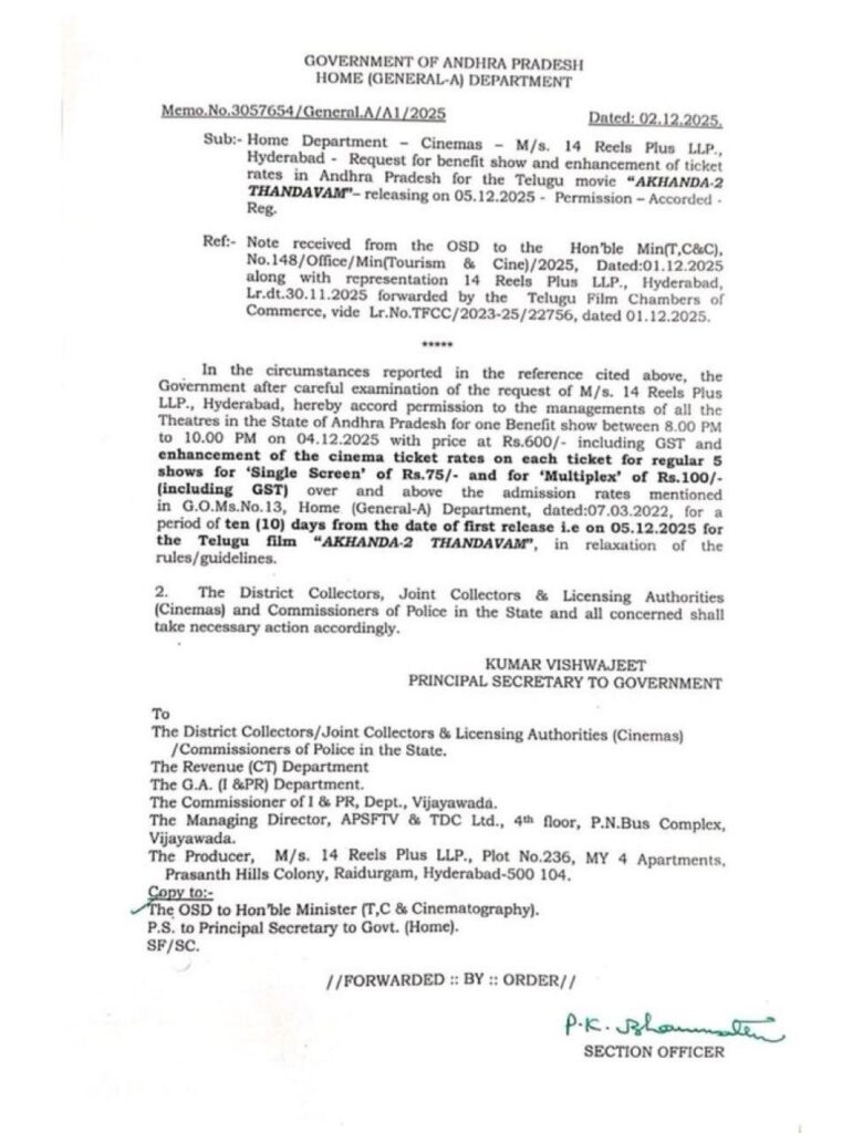 కోట్ల రూపాయల బడ్జెట్‌తో నిర్మించిన సినిమాకు మరింత అధిక లాభాలు కల్పించేందుకు ప్రభుత్వం టికెట్ ధరల పెంపునకు గ్రీన్ సిగ్నల్ ఇస్తోంది. డిసెంబర్ 4న ప్రీమియర్ షో కోసం ఏకంగా రూ.600, ఆ తర్వాత 10 రోజుల పాటు అదనపు ధరలు వసూలు చేయాలని జీఓ జారీ చేయడం మధ్యతరగతి సినీ అభిమానులకు తీవ్ర భారం. సినిమా అనేది వినోదం కోసమే కానీ, సామాన్య ప్రేక్ష‌కుల జేబుల‌కు చిల్లుపెట్టేందుకు కాదనే విమర్శలు వినిపిస్తున్నాయి.
