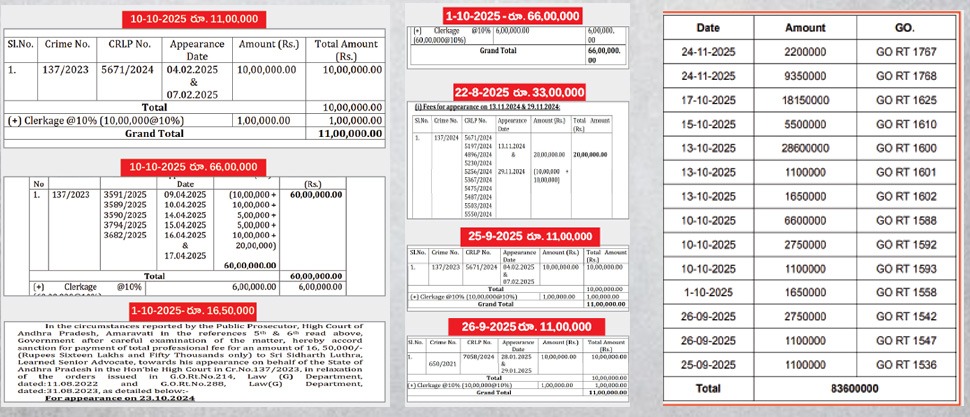 గతంలో స్కిల్ స్కామ్ (Skill Scam) కేసులో చంద్రబాబు తరపున వాదించి బెయిల్ మంజూరు కృషిచేసిన‌ లూథ్రా, ఇప్పుడు టీడీపీ ప్రభుత్వానికి (TDP Government) ‘అస్థాన న్యాయవాది’గా మారిపోయారన్న ఆరోపణలు వినిపిస్తున్నాయి. లూథ్రా ఒక్కరోజు ఒక కేసులో హాజ‌రైనందుకు ఆయ‌న‌కు రూ.11 లక్షలు (జీఎస్టీతో కలిపి) వసూలు చెల్లిస్తున్న‌ట్లుగా వెల్లడవుతోంది. నిన్న ఒక్క రోజే రూ.1.15 కోట్లు విడుద‌ల చేస్తూ రెండు ఆర్డ‌ర్స్ విడుద‌ల‌వ్వ‌డం గ‌మ‌నార్హం.