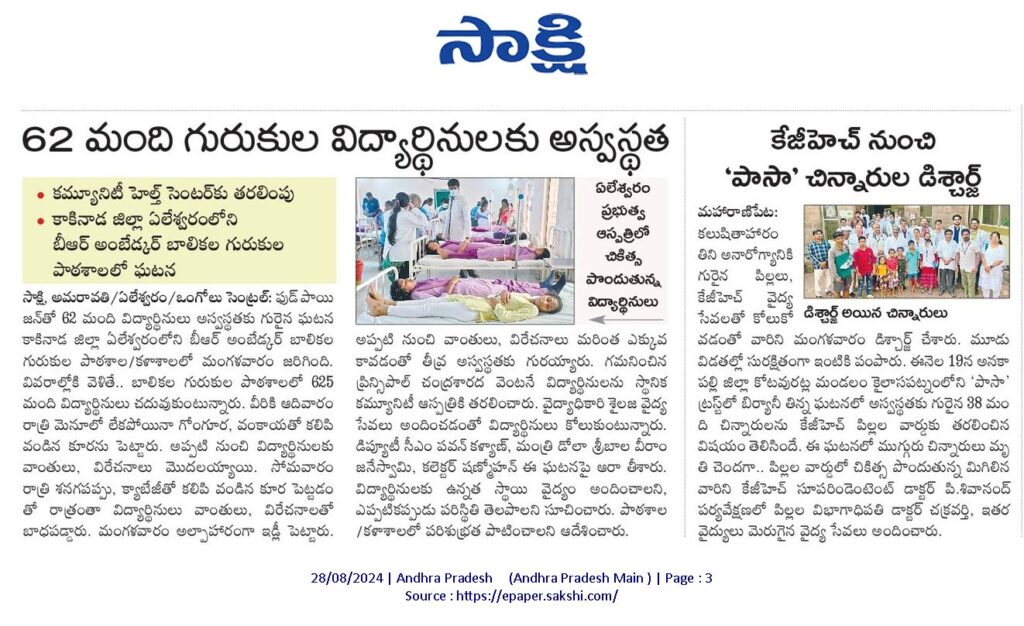 27.08.2024న కాకినాడ జిల్లా ఏలేశ్వరంలోని బీఆర్ అంబేద్కర్ బాలికల గురుకుల పాఠశాల/కాలేజీలో ఫుడ్ పాయిజన్. 62 మంది గురుకుల విద్యార్థినులకు అస్వస్థత.