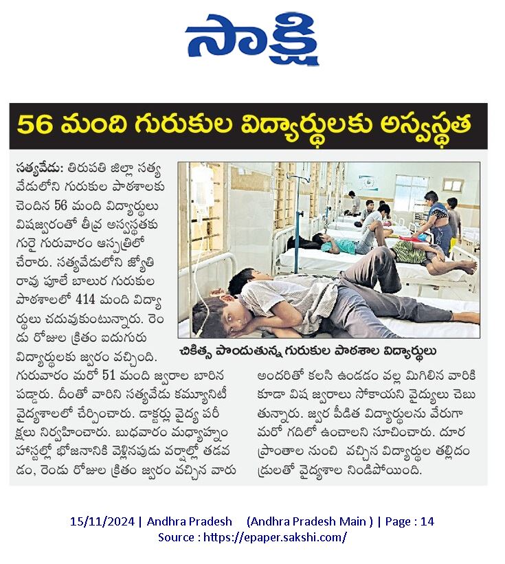 15.11.2024న తిరుపతి జిల్లా సత్యవేడులోని గురుకుల పాఠశాలకు చెందిన 56 మంది విద్యార్థులకు తీవ్ర అస్వస్థత. జ్యోతిరావుపూలే బాలుర గురుకుల పాఠశాలలో భోజనానికి వెళ్లినప్పుడు అపరిశుభ్రత, వర్షాల వల్ల విష జ్వరాలు.