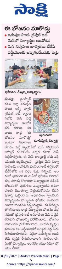 03.08.2025న పురుగులు పడిన భోజనం మాకొద్దంటూ వైయస్సార్ కడప జిల్లా ఇడుపులపాయ ట్రిపుల్ ఐటీ మెస్ లో విద్యార్థుల ఆందోళన.
