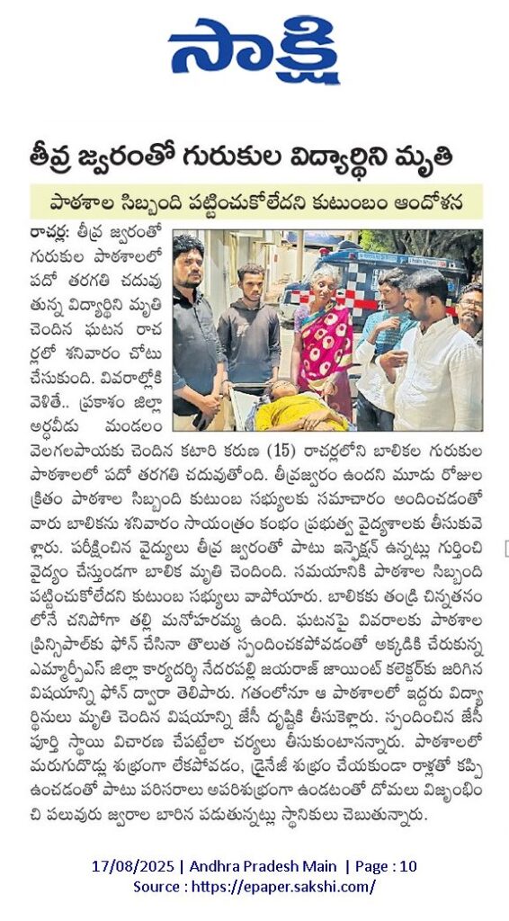 17.08.2025న తీవ్ర జ్వరంతో గురుకుల విద్యార్థిని మృతి. రాచర్ల బాలికల గురుకుల పాఠశాలలో పదో తరగతి చదువుతున్న ప్రకాశం జిల్లా అర్థవీడు మండలం వెలగలపాయకు చెందిన కటారి కరుణ (15). తీవ్ర జ్వరం రావడంతో మృత్యువాత.