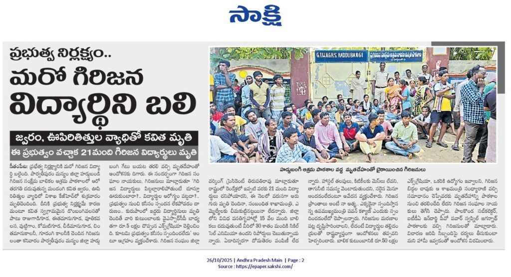 26.10.2025న ప్రభుత్వ నిర్లక్ష్యం.. మరో గిరిజన విద్యార్థిని బలి. జ్వరం, ఊపిరితిత్తుల వ్యాధితో కవిత మృతి. పార్వతీపురం మన్యం జిల్లా హడ్డుబంగి పాఠశాల వద్ద బాలిక మృతదేహంతో ఆందోళన.