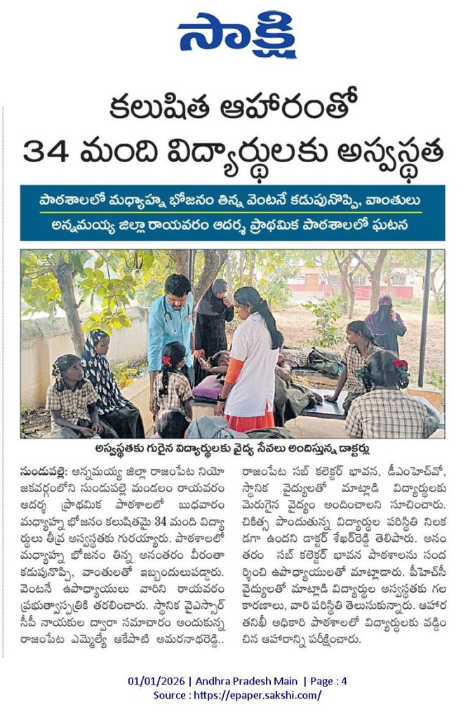 01.01.2026న కలుషిత ఆహారంతో 34 మంది విద్యార్థులకు అస్వస్థత. పాఠశాలలో మధ్యాహ్న భోజనం తిన్న వెంటనే కడుపునొప్పి, వాంతులు. అన్నమయ్య జిల్లా రాయవరం ఆదర్శ ప్రాథమిక పాఠశాలలో ఘటన.