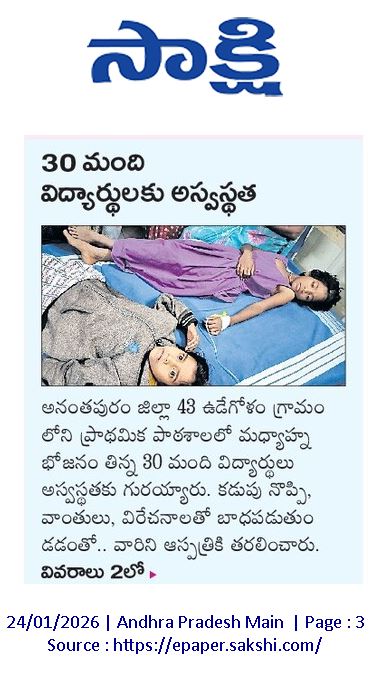 24.01.2026న 30 మంది విద్యార్థినులకు అస్వస్థత. అనంతపురం జిల్లా 43 ఉడేగోళం గ్రామంలోని ప్రాథమిక పాఠశాలలో మధ్యాహ్న భోజనం తిన్న తర్వాత ఘటన.