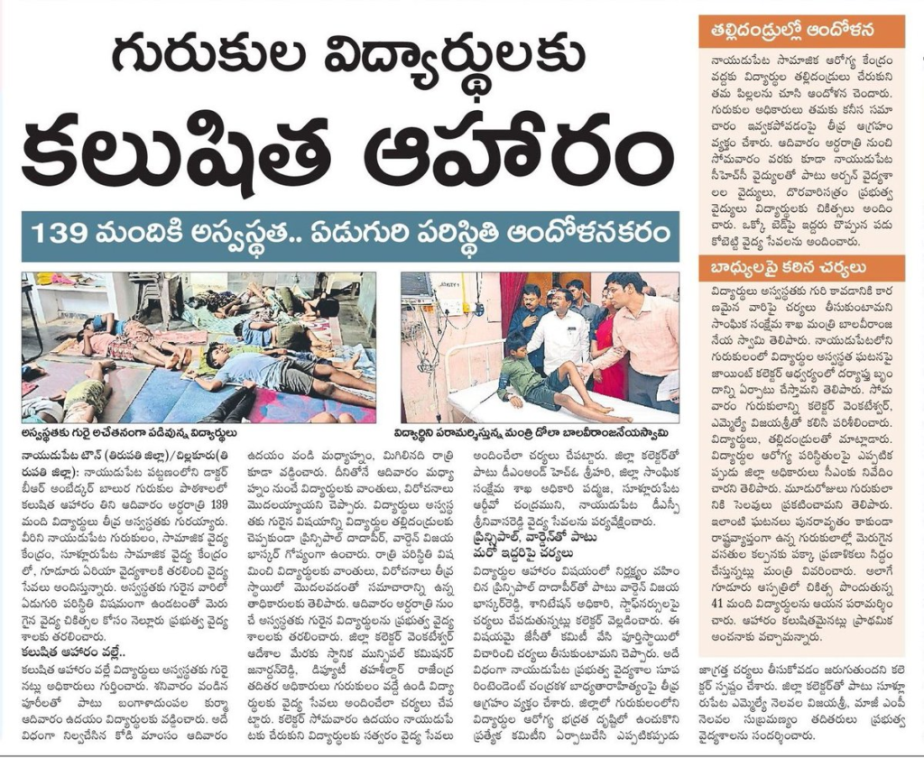 15.07.2024న తిరుపతి జిల్లా నాయుడుపేటలో కలుషిత ఆహారంతో 139 మంది గురుకుల విద్యార్థులకు అస్వస్థత.. ఏడుగురి పరిస్థితి ఆందోళనకరంగా మారింది.