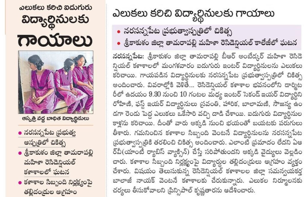 27.08.2024న శ్రీకాకుళం జిల్లా తామరాపల్లి మహిళా రెసిడెన్షియల్ కాలేజీలో ఎలుకలు కరిచి ఐదుగురు విద్యార్థినులకు గాయాలు. నరసన్నపేట ప్రభుత్వాస్పత్రిలో చికిత్స.