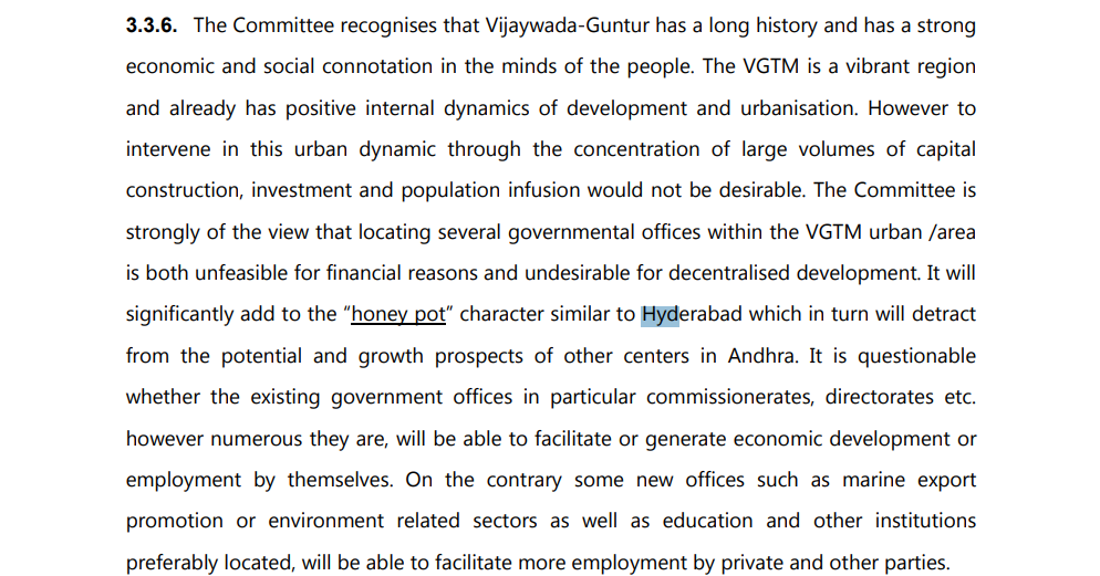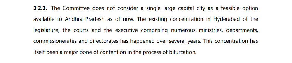 హైదరాబాద్ తప్పు పునరావృతం వద్దు: ఉమ్మడి రాష్ట్రంలో అభివృద్ధి అంతా హైదరాబాద్‌లోనే కేంద్రీకృతం కావడం వల్ల విభజన సమయంలో తలెత్తిన సమస్యలను కమిటీ గుర్తు చేసింది. రాజధాని విషయంలో హైదరాబాద్‌లో చేసిన తప్పును ఆంధ్రప్రదేశ్‌లో మళ్లీ చేయవద్దని స్పష్టంగా హెచ్చరించింది.
