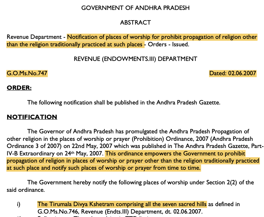On the same day, GO No. 747 was issued prohibiting the propagation of other religions within Tirumala limits. Another GO extended this prohibition to the surroundings of 19 major temples across the state.
