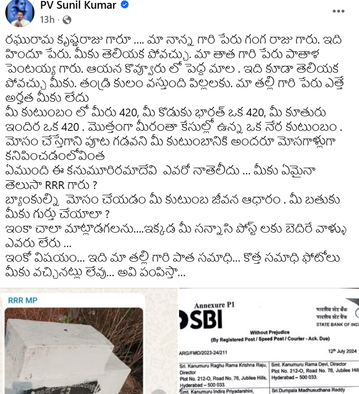 ”మీ కుటుంబంలో మీరు 420, మీ కొడుకు భరత్ 420, మీ కూతురు ఇందిర ఒక 420 . మొత్తంగా మీరంతా కేసుల్లో ఉన్న ఒక నేర కుటుంబం. మోసం చేస్తేగాని పూట గడవని మీ కుటుంబానికి అందరూ మోసగాళ్లుగా కనిపించడంలో వింత ఏముంది..? ఈ కనుమూరి రమాదేవి ఎవరో నాతెలీదు.. మీకు ఏమైనా తెలుసా RRR? బ్యాంకుల్ని మోసం చేయడం మీ కుటుంబ జీవన ఆధారం. మీ బతుకు మీకు గుర్తు చేయాలా? ఇంకా చాలా మాట్లాడగలను.. ఇక్కడ మీ సన్నాసి పోస్ట్ లకు బెదిరే వాళ్ళు ఎవరు లేరు” అంటూ ఘాటుగా స్పందిస్తూ ఫేస్బుక్లో పీవీ సునీల్ కుమార్ పోస్ట్ చేశారు.