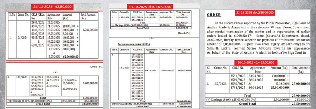 ప్రభుత్వం తరఫున కోర్టుకు హాజరవుతున్న సిద్ధార్థ్ లూథ్రాకు తాజాగా ఈరోజు మరో రూ.33 లక్షలు విడుదల చేస్తూ చంద్రబాబు ప్రభుత్వం (Chandrababu Government) ఉత్తర్వులిచ్చింది. గతేడాది నవంబర్ 24న ప్రభుత్వం రెండు వేర్వేరు ఉత్తర్వుల ద్వారా లూథ్రాకు ఏకంగా రూ.1.15 కోట్లు విడుదల చేయడం గమనార్హం. సాధారణంగా ఒక రోజు కోర్టుకు హాజరైనందుకు జీఎస్టీతో కలిపి సుమారు రూ.10 లక్షలు వసూలు చేస్తున్నారు.