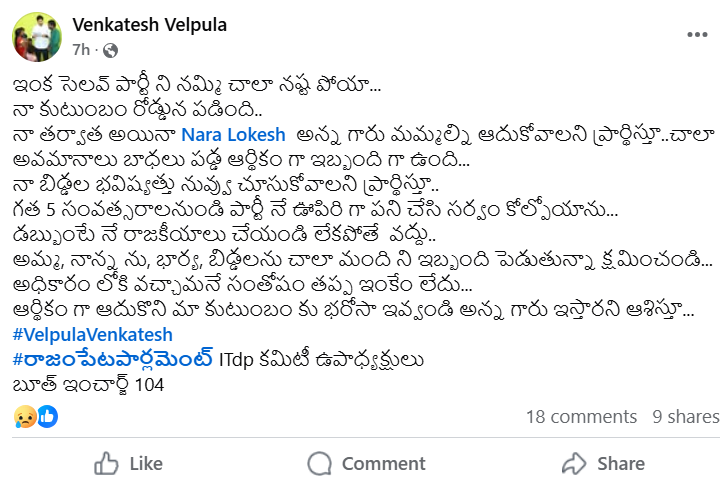ఇక సెలవు పార్టీని నమ్మి చాలా నష్టపోయాన‌ని భావోద్వేగ పోస్టు పెట్టారు. త‌న‌ కుటుంబం రోడ్డున పడిందని, చాలా అవమానాలు బాధలు పడ్డాన‌ని, గత 5 సంవత్సరాలుగా పార్టీనే ఊపిరిగా పనిచేసి సర్వం కోల్పోయానని సంచ‌ల‌న వ్యాఖ్య‌లు చేశారు. డబ్బుంటేనే రాజకీయాలు చేయండి లేకపోతే వద్దని త‌న తోటి వారికి సూచించారు. అధికారంలోకి వచ్చామనే సంతోషం తప్ప ఇంకేం లేదని ఆవేద‌న వ్య‌క్తం చేశారు. ఈ ఘటన టీడీపీ వర్గాల్లో తీవ్ర కలకలం రేపుతోంది. రాజంపేట పార్ల‌మెంట్ ఐ-టీడీపీ ఉపాధ్య‌క్షుడిగా ప‌నిచేస్తున్న వెంక‌టేశ్ ప‌రిస్థితి ఆ పార్టీ క్యాడ‌ర్‌ (Party Cadre) ను గంద‌ర‌గోళంలో ప‌డేసింది.