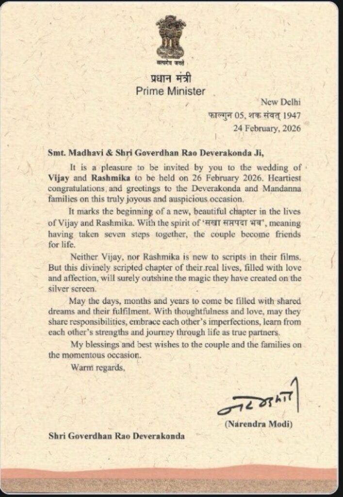 విజయ్ దేవరకొండ తల్లిదండ్రులు పంపిన వివాహ ఆహ్వాన పత్రికకు స్పందించిన ప్రధాని మోదీ, ఒక ప్రత్యేక సందేశాన్ని పంపారు. “విజయ్ మరియు రష్మికల జీవితంలో ఇది ఒక అందమైన కొత్త అధ్యాయానికి నాంది. ‘సప్తపది’ (Saptapadi)అనే పవిత్ర సంప్రదాయంతో ఏడడుగులు వేస్తూ జీవితాంతం స్నేహితులుగా, తోడుగా ఉండాలని ఆకాంక్షిస్తున్నాను” అని మోదీ తన సందేశంలో పేర్కొన్నారు. దేవరకొండ మరియు మందన్న కుటుంబాలకు కూడా ఆయన అభినందనలు తెలిపారు. ఉదయ్పూర్లోని ఐటీసీ మెమెంటోస్ హోటల్లో ఈ వేడుకలు అట్టహాసంగా జరుగుతున్నాయి.