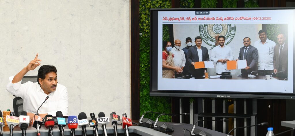 2020 డిసెంబరు 9న సర్వే ఆఫ్ ఇండియాతో ఒప్పందం కుదుర్చుకుని, యూరప్లో ఉపయోగించే ఆధునిక టెక్నాలజీని రీసర్వేలో వినియోగించినట్లు జగన్ తెలిపారు. ఈ కృషికి గుర్తింపుగా కేంద్ర ప్రభుత్వం 2023 డిసెంబరు 20న పార్లమెంటులో ఏపీ రీసర్వేకు ప్లాటినమ్ గ్రేడింగ్ వచ్చినట్లు ప్రకటించిందన్నారు.